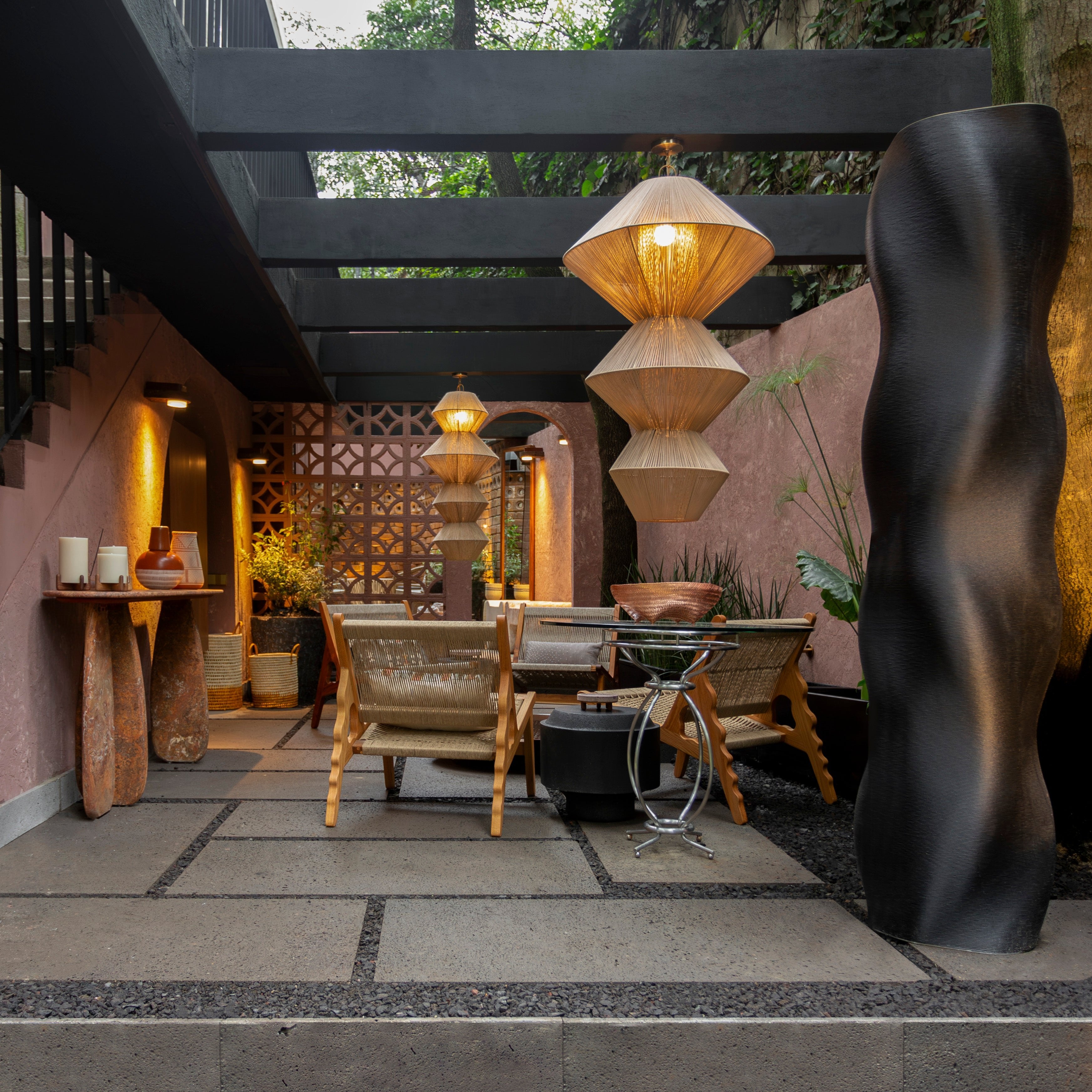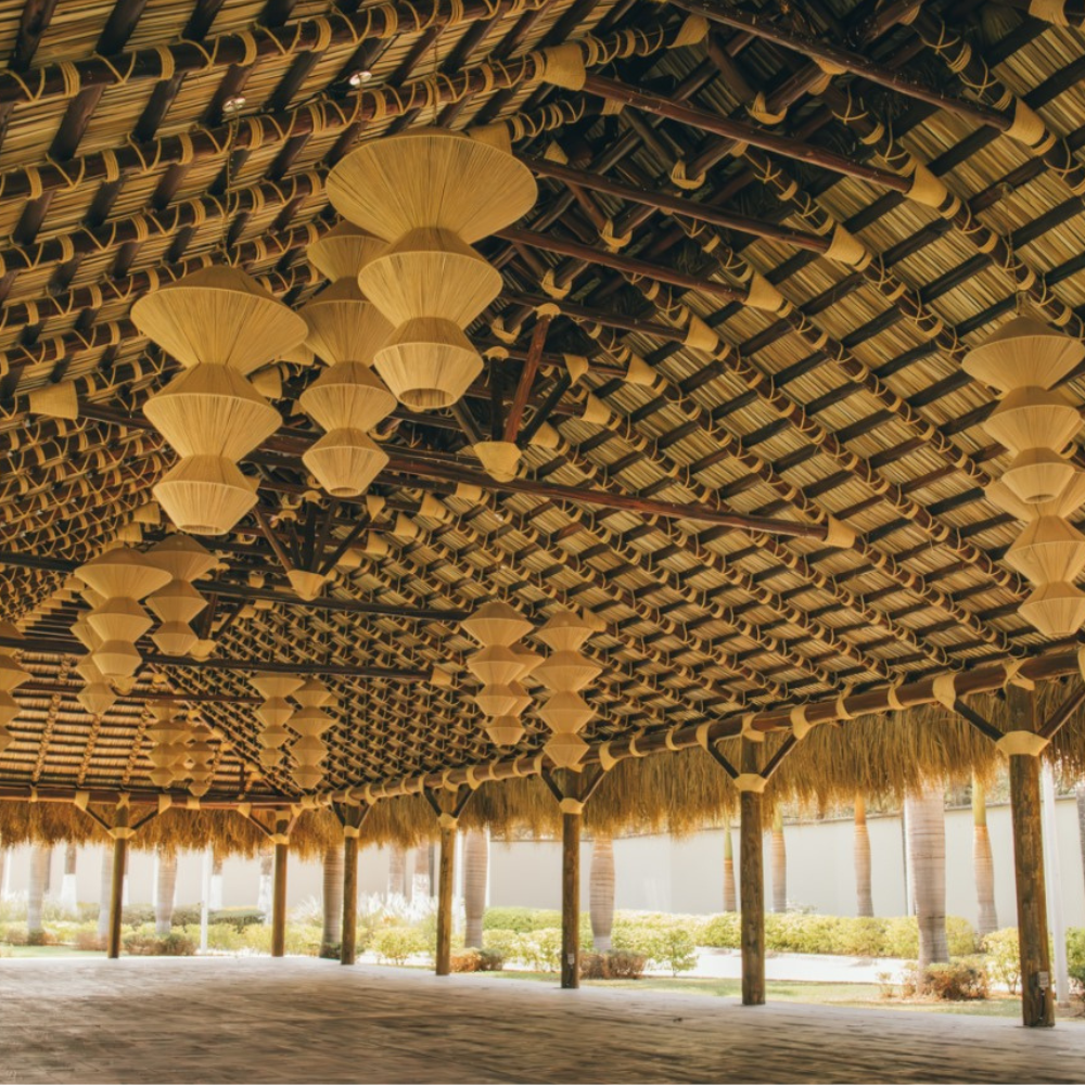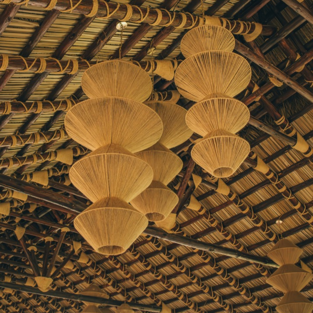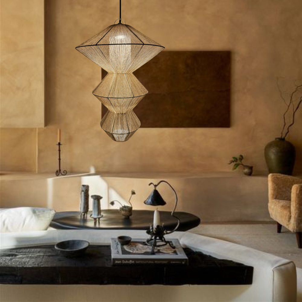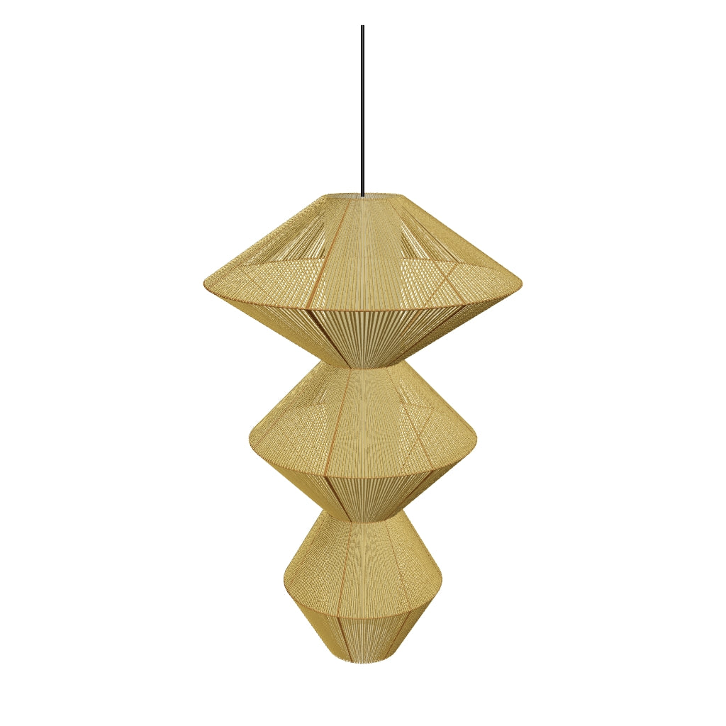 Nuestra BENGALA I es una sencilla composición geométrica que encuentra el balance en la combinación de sus formas inorgánicas y sus materiales orgánicos.  Esta lámpara destaca un especial trabajo de tejido que se transmite en un diseño elegante y cálido.