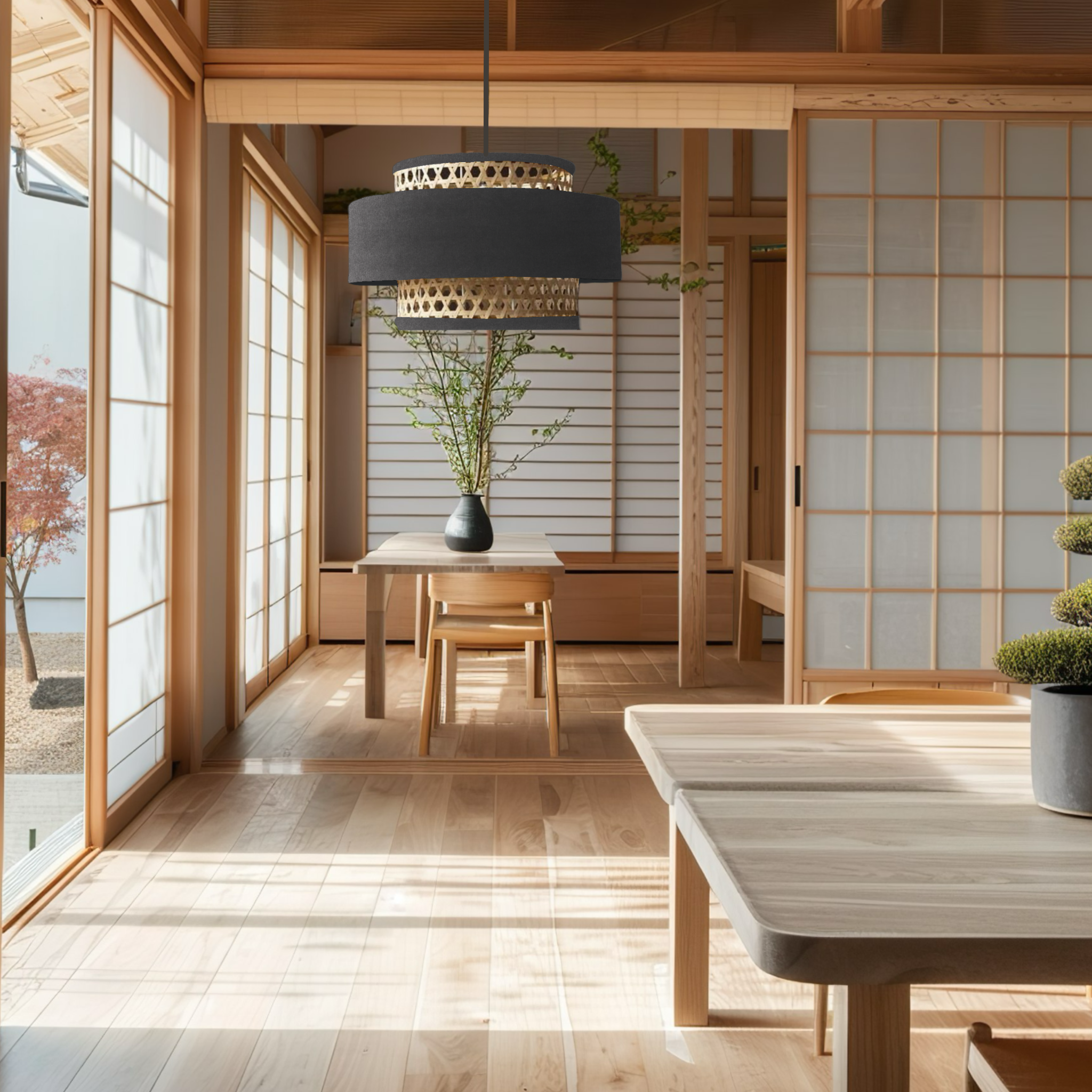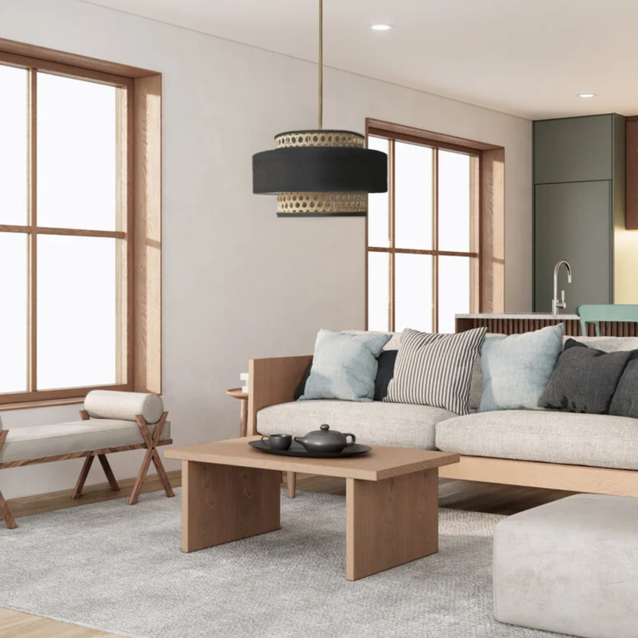 La lámpara LANNA combina de forma armoniosa la textura natural del bejuco con la suavidad del terciopelo, creando una pieza que destaca tanto por su estilo como por su calidez. Esta fusión de materiales aporta un contraste equilibrado, donde la rusticidad del bejuco se complementa con la elegancia del terciopelo, generando una iluminación que añade un toque sofisticado y acogedor a cualquier espacio.